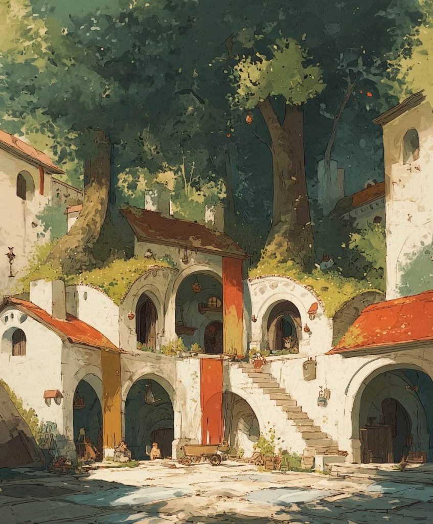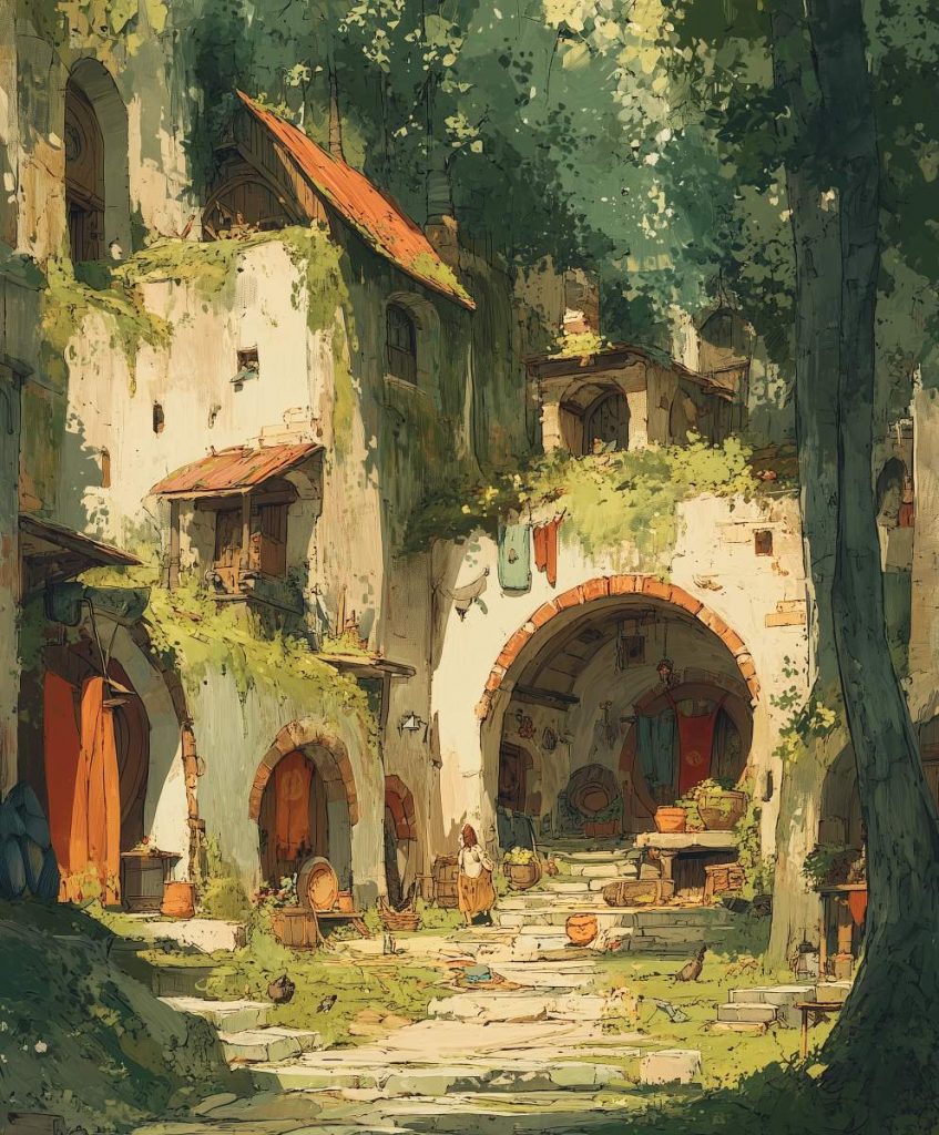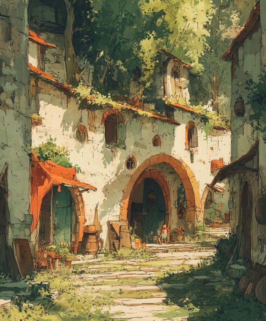 Le tegole sbiadite del villaggio apparvero quasi all’improvviso in mezzo alle fronde degli alberi, incorniciate da colline verdi e viottoli ciottolati, attraversati da un calmo fiume che scintillava al sole. Era il giorno del mercato del sabato e la piazza, circondata da alberi robusti, era piena di bancarelle colorate, voci allegre e profumi invitanti. Sam si guardò intorno, mentre i pony del signor Sottoquercia si facevano largo a fatica tra la folla, osservando la gente che si scambiava saluti e merci con un’atmosfera di gioiosa tranquillità nelle strette vie che salivano e scendevano per i colli.